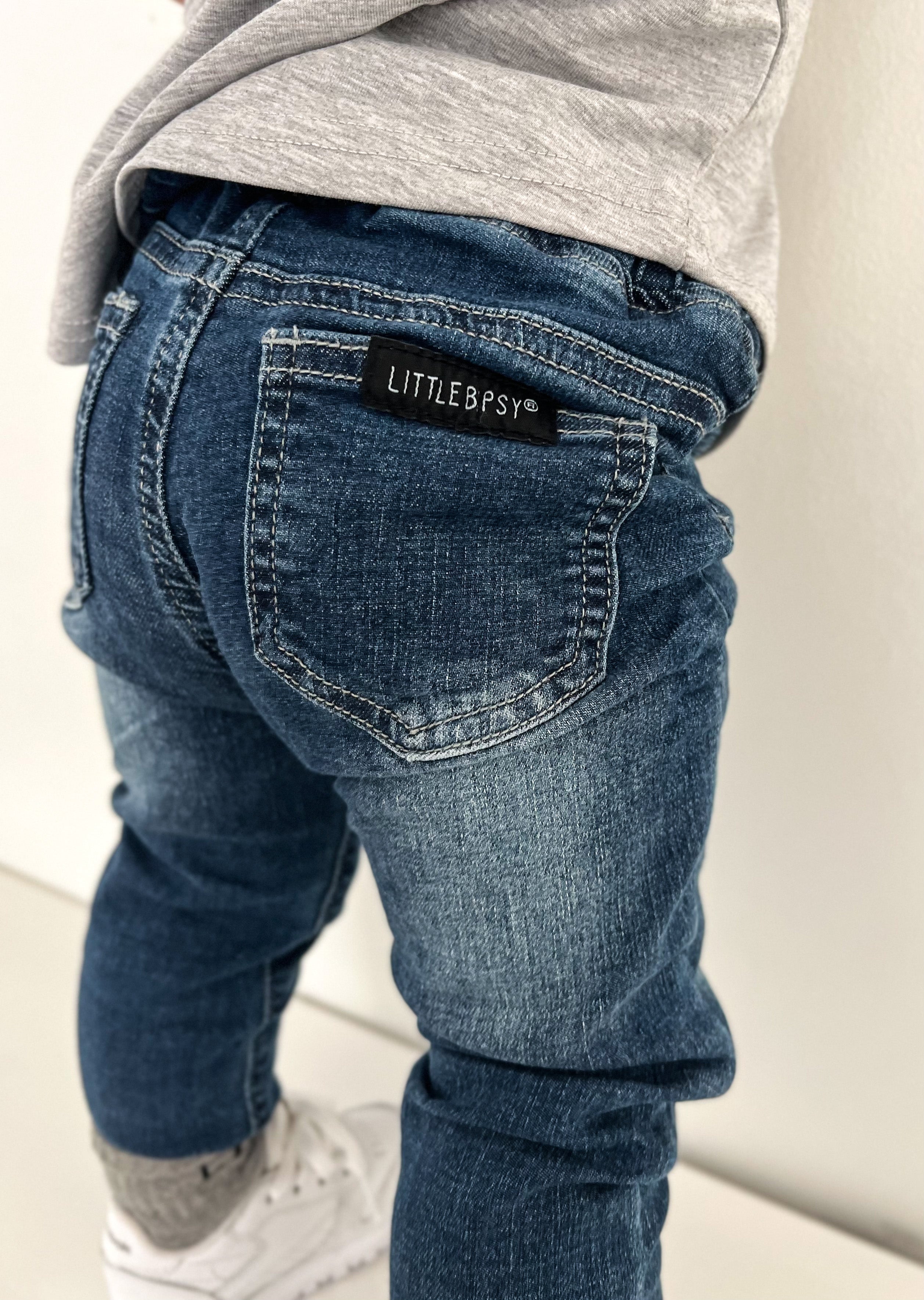 Meet your new favorite jeans. Our Classic Denim pairs timeless style with all-day comfort, featuring a custom blue wash, stretchy 4-way fabric, and a straight-leg slim fit. Designed with an elastic waistband and functional drawstring, they’re perfect for easy dressing and non-restricting play.